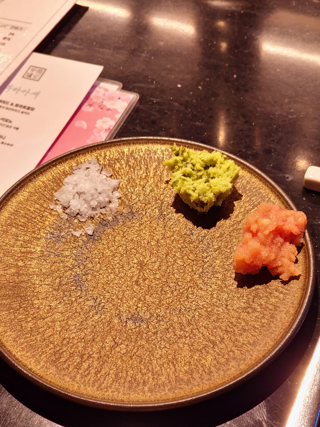 찍어먹는 소스로는 소금과 명란, 고추냉이가 준비되어